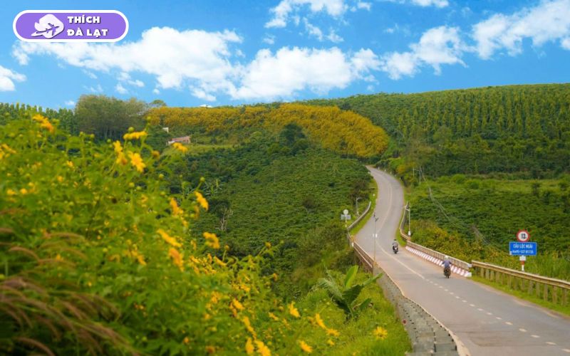 Đây là cung đường được nhiều người đánh giá là đẹp nhất để ngắm hoa dã quỳ. Hai bên đường là hoa mọc xen lẫn rừng thông, đồi đất đỏ và nương rẫy, tạo nên khung cảnh rất đặc trưng của vùng cao nguyên. Đi vào buổi sáng hoặc chiều muộn, ánh nắng chiếu lên hoa khiến khung cảnh càng thêm nổi bật.